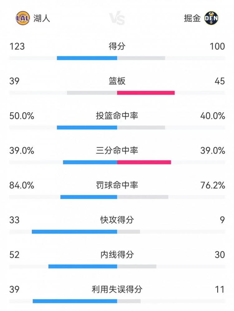 在利用對方失誤得分上,湖人也是39-11遙遙領先掘金。