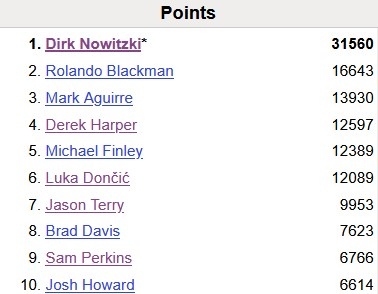 本場(chǎng)過(guò)后,諾維茨基隊(duì)史得分來(lái)到16644分,超越羅蘭多-布萊克曼(16643分),成為球隊(duì)的得分王。而諾維茨基在小牛的最終職業(yè)生涯得分定格在31560分。