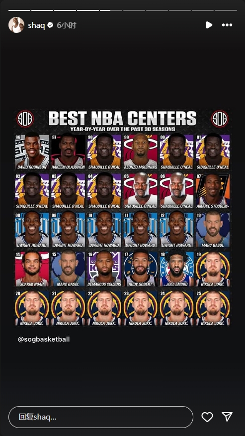 奧尼爾曬過去30年最佳中鋒:自己9年8度上榜 約基奇統(tǒng)治最近7年