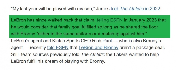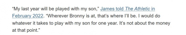2022年2月,詹姆斯在接受The Athletic采訪時(shí)第一次談到父子同臺(tái)的愿望:“我在生涯最后一年會(huì)和我兒子一起打球,無(wú)論布朗尼在哪里,我都會(huì)去那個(gè)地方。我愿意做任何事情來(lái)實(shí)現(xiàn)與我的兒子一起打球一年。屆時(shí)錢(qián)也就不重要了。”