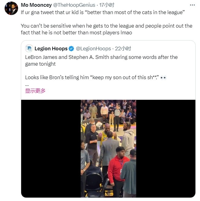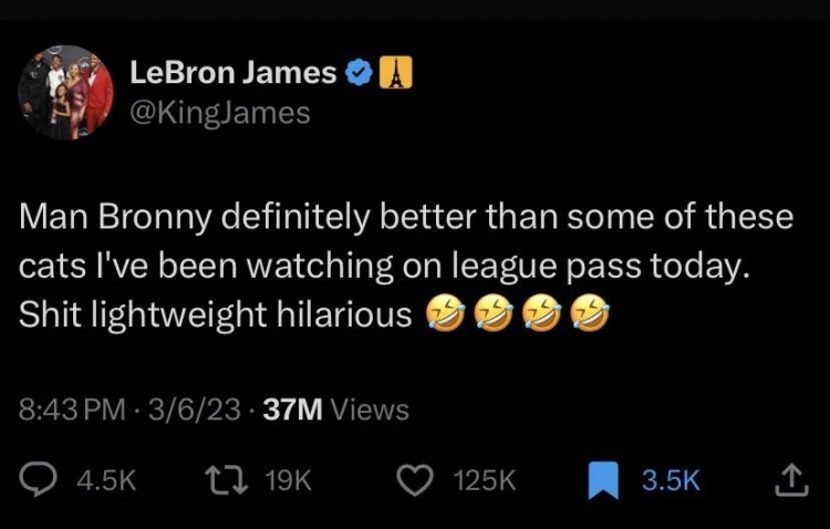 在2023年3月6日,詹姆斯發(fā)推寫(xiě)道:“天啊,布朗尼絕對(duì)強(qiáng)于今天我在聯(lián)盟通(注:NBA官方比賽直播服務(wù))上看到的一些阿貓阿狗。這場(chǎng)面真的有點(diǎn)好笑????????????????”