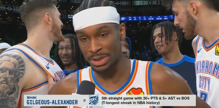據(jù)統(tǒng)計,亞歷山大對陣凱爾特人已經(jīng)連續(xù)5場拿下至少30分5助攻,追平NBA歷史紀錄!