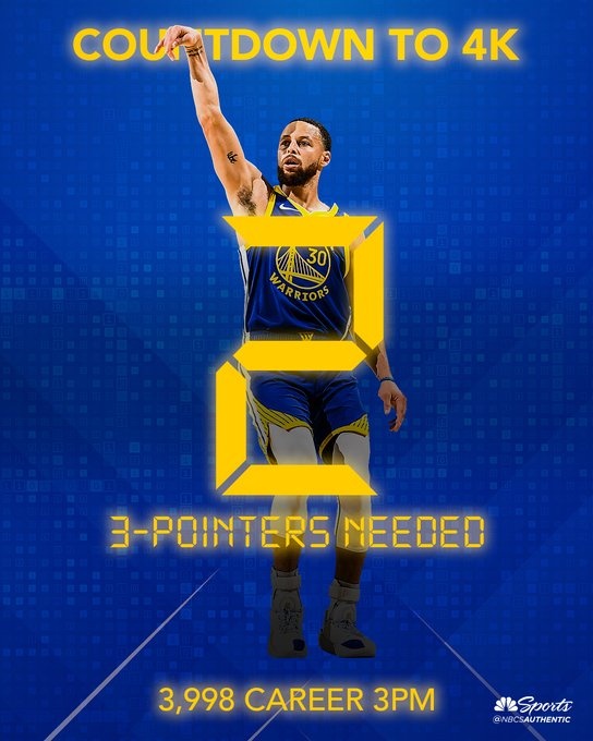 值得一提的是,庫里還差兩記三分就能解鎖4000記三分里程碑。