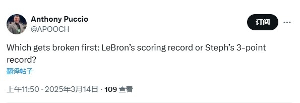 對此,記者Anthony Puccio發(fā)推問道:“詹姆斯的得分紀(jì)錄和庫里的三分紀(jì)錄,哪個(gè)會先被打破?”