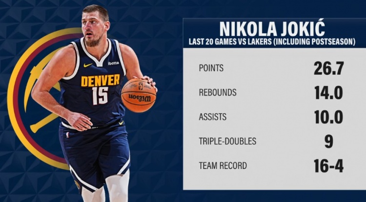 約基奇過去20場對陣湖人:場均26.7分14板10助&9次三雙 16勝4負(fù)
