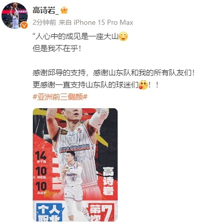 賽后,高詩(shī)巖發(fā)文寫道:“人心中的成見是一座大山,但是我不在乎!感謝邱導(dǎo)的支持,感謝山東隊(duì)和我的所有隊(duì)友們!更感謝一直支持山東隊(duì)的球迷們!!”