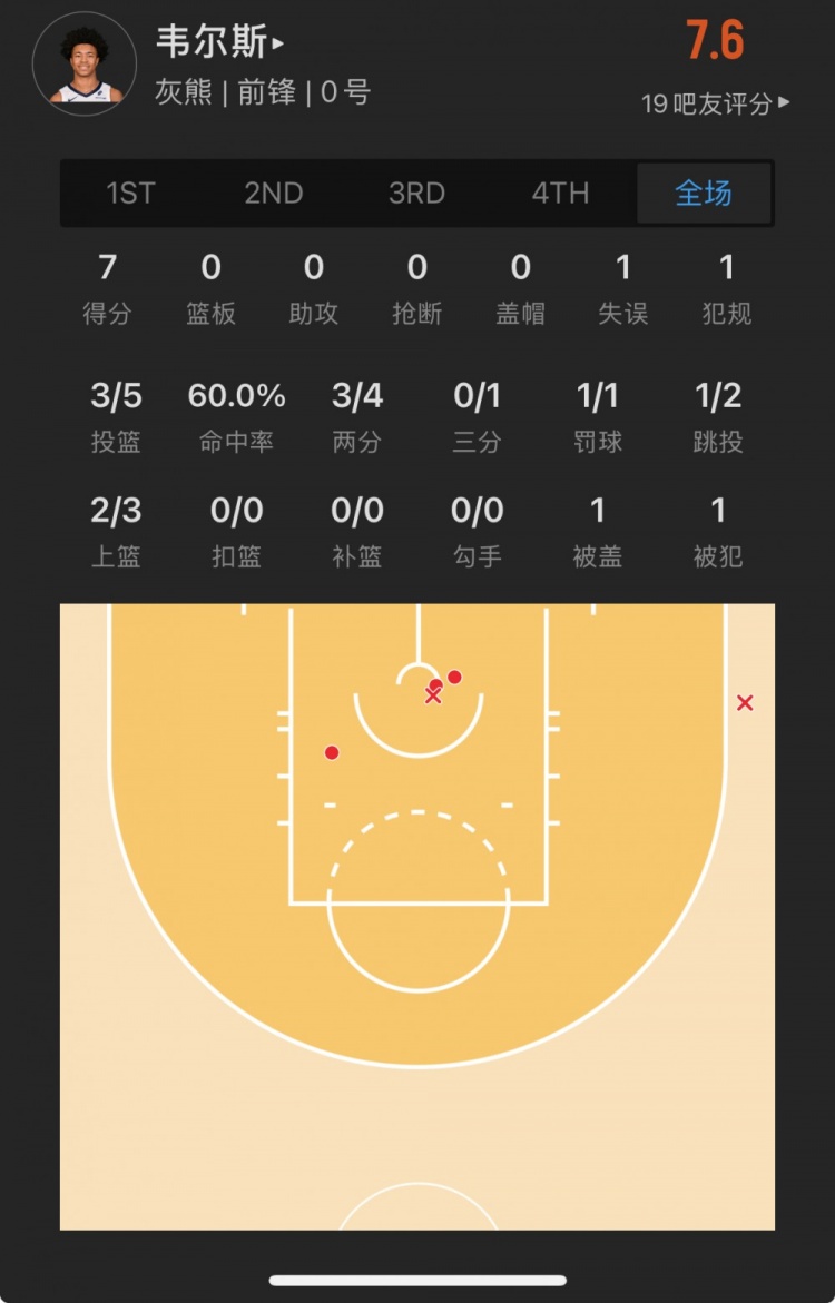 灰熊39號(hào)秀 杰倫-韋爾斯 登場(chǎng)16.7分鐘