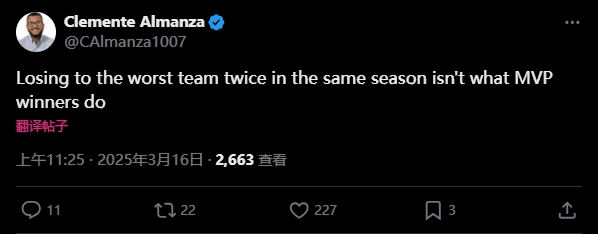 賽后,雷霆記者Clemente Almanza發(fā)推寫(xiě)道:“同一個(gè)賽季兩次輸給聯(lián)盟最差的球隊(duì),這可不是MVP該有的表現(xiàn)哦。”