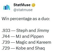 庫里+巴特勒勝率93.3%!美媒對比:喬丹皮蓬74.4% 科比鯊魚72.9%
