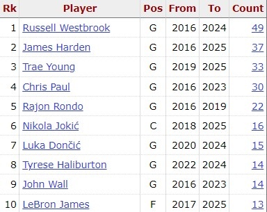 威少過去10個賽季50次半場助攻上雙 同期最多 哈登37次第二
