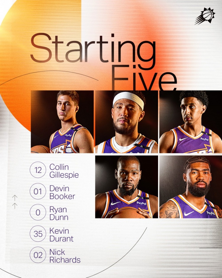 太陽(yáng)公布了本場(chǎng)首發(fā):吉萊斯皮、布克、鄧恩、KD、理查茲。