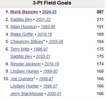 本場比賽,比斯利投進5記三分,本賽季累計投進272個三分,成為活塞隊史首位單賽季三分命中數(shù)突破270記的球員。