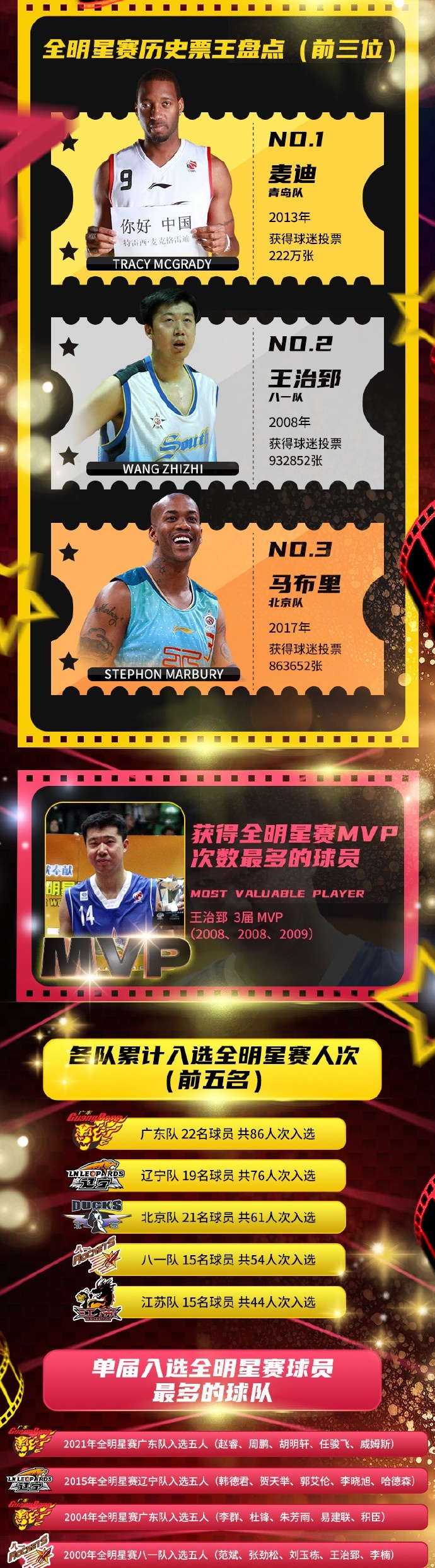 CBA全明星歷史榮耀數(shù)據(jù):朱芳雨15次入選冠絕聯(lián)盟 麥迪歷史票王