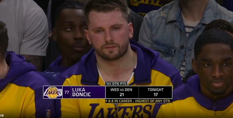 東契奇火力全開半場(chǎng)7三分爆砍29分 詹姆斯找狀態(tài) 湖人落后公牛3分
