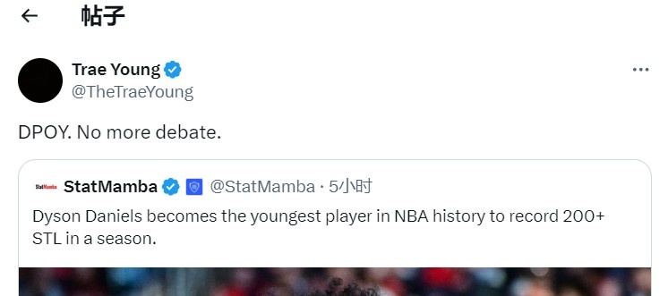 比賽結(jié)束后,老鷹球星特雷-楊轉(zhuǎn)發(fā)了丹尼爾斯的這一數(shù)據(jù),并在旁邊寫(xiě)道:“年度最佳防守球員。停止?fàn)幷??!?/p>