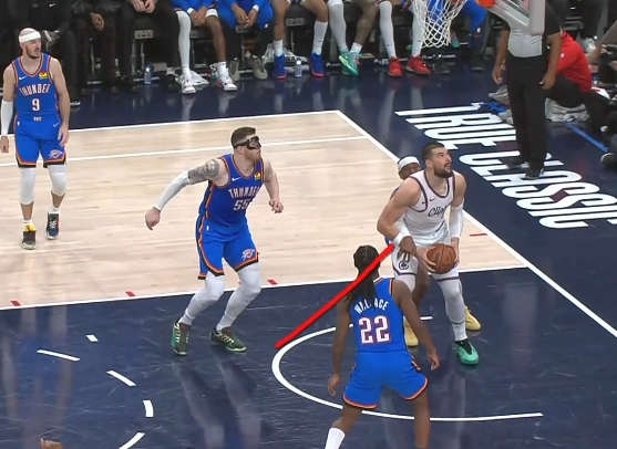 比賽最后1:37,快船落后1分,祖巴茨在籃下成功要位并接到傳球,但是被亞歷山大一把切掉,裁判當下吹罰了前場球。