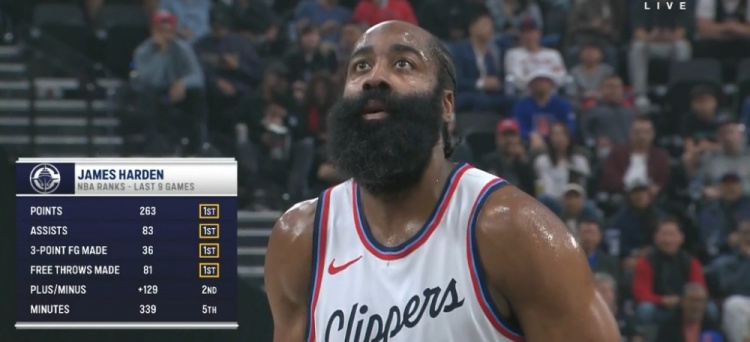 過(guò)去9場(chǎng)哈登263分、83助、命中36記三分、罰中81球皆聯(lián)盟第一;總正負(fù)值+129第二,出戰(zhàn)339分鐘第五