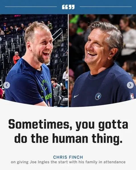 正因如此,當(dāng)芬奇知道雅各布還會(huì)接著觀看這一場(chǎng)與鵜鶘的比賽之后,他不想給英格爾斯和雅各布留下任何的遺憾。他首先找到了從爵士時(shí)期就與英格爾斯共事的老隊(duì)友康利,康利早就了解英格爾斯家庭的困境,毫不猶豫地表示支持,并主動(dòng)讓出了自己的首發(fā)位置。