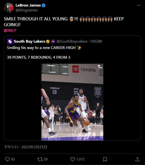 賽后,詹姆斯轉(zhuǎn)發(fā)了布朗尼的賽場(chǎng)集錦并寫道:“保持微笑,繼續(xù)前進(jìn),年輕的王子!加油!”