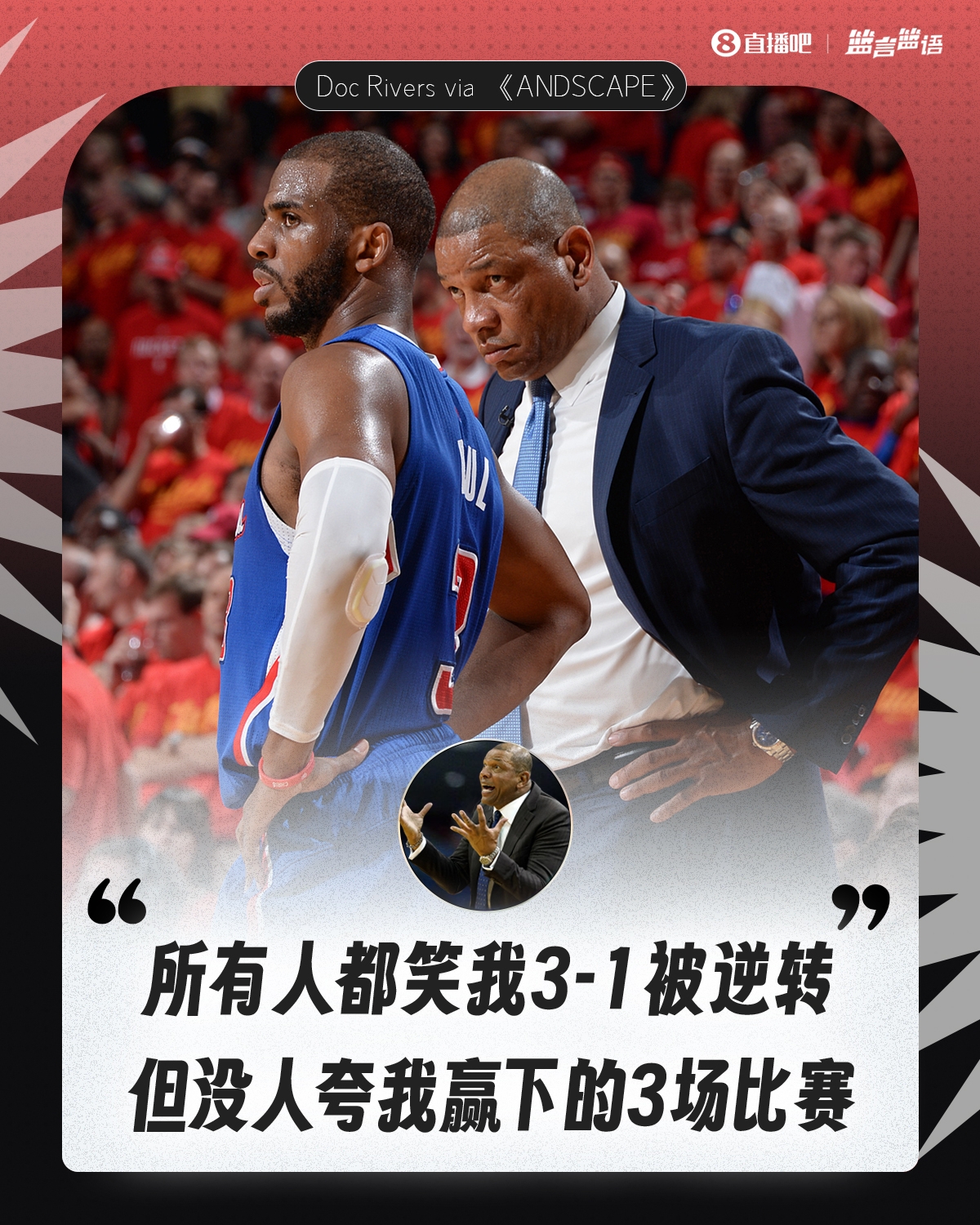 在談到自己飽受詬病的“系列賽多次3比1領(lǐng)先被翻盤”的話題時,里弗斯坦然表示:“我曾帶領(lǐng)一支排名第8的球隊3比1領(lǐng)先。在快船的那次是唯一一次讓勝利溜走了,沒有人講出真實的故事,沒人意識到保羅當(dāng)時拖著一條傷腿在場上奔跑。這在某種程度上是不公平的,我贏得3場勝利沒有得到足夠的認可,大家只記住了輸?shù)舻谋荣?。我總是說,‘如果我們6場內(nèi)輸給火箭會怎樣?那就沒人在意了。
