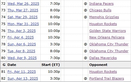本賽季湖人還有11場常規(guī)賽,對(duì)手依次是步行者、公牛、灰熊、火箭、勇士、鵜鶘、雷霆、雷霆、獨(dú)行俠、火箭、開拓者。