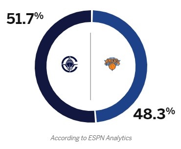 ESPN給出了本場(chǎng)比賽勝率預(yù)測(cè),其中快船51.7%,尼克斯48.3%。