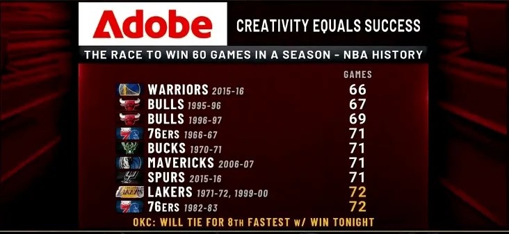 據(jù)統(tǒng)計(jì),雷霆僅用72場(chǎng)比賽就取得60場(chǎng)勝利,追平NBA歷史第八快,詳情如下:
