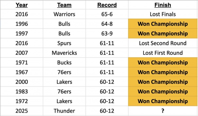 另外,雷霆是歷史上就11支在賽季前72場(chǎng)拿到60+勝的球隊(duì),此前10支球隊(duì)有7支最終奪冠。