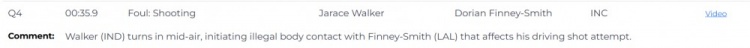 比賽最后35.9秒,湖人118-119落后一分,步行者球員賈雷斯-沃克防守時半空中轉(zhuǎn)身,與芬尼-史密斯發(fā)生非法身體接觸,影響了后者的上籃出手,此為犯規(guī)漏吹,芬尼-史密斯應(yīng)該獲得兩罰。