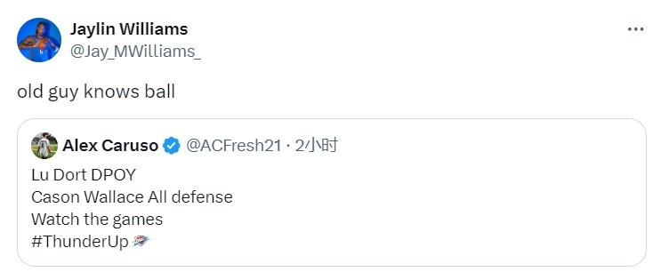 杰林-威廉姆斯對此也十分認(rèn)同,他轉(zhuǎn)發(fā)了卡魯索的這條動態(tài),并在旁邊寫道:“老將懂球?!?/p>