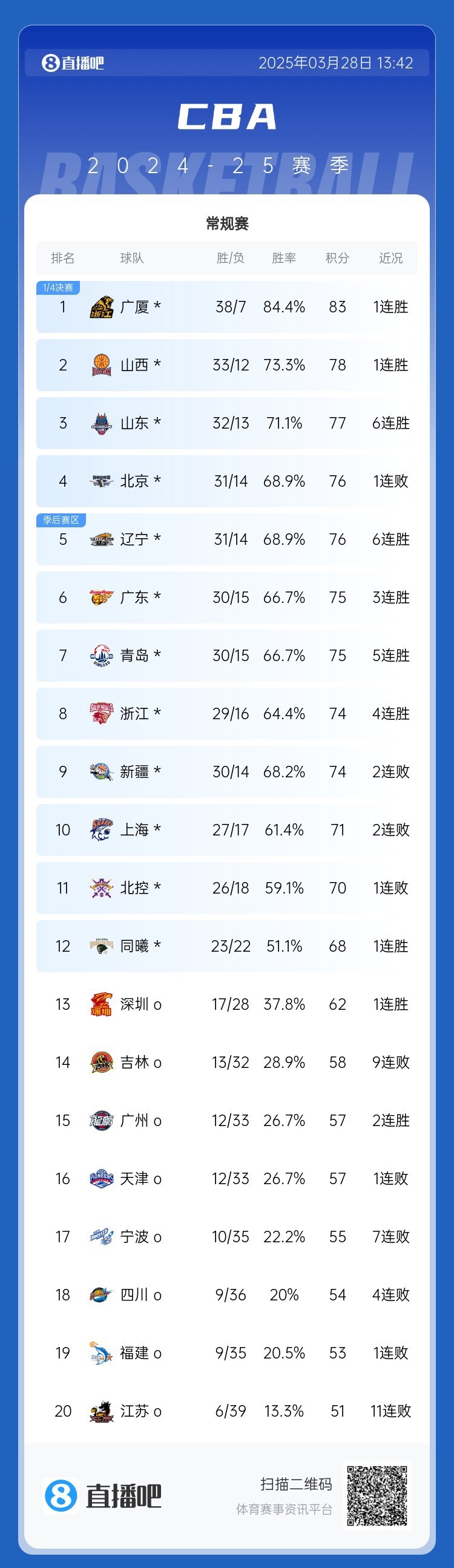 3月28日訊 本賽季常規(guī)賽第45輪昨晚已經(jīng)全部結(jié)束,本輪比賽過后,本賽季的排名形勢(shì)進(jìn)一步明朗。