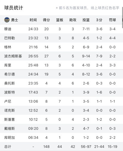 波杰姆斯基27分6板5助、穆迪20分3板3助3斷、希爾德19分5板4助3斷、格林14分5板2助、巴特勒13分3板8助4斷、庫里13分3板6助、盧尼8分7板1助、戴維斯8分3板2助、波斯特7分2板1助、諾克斯6分2板、斯潘塞5分4助、桑托斯4分4板6助2斷、庫明加4分1板。