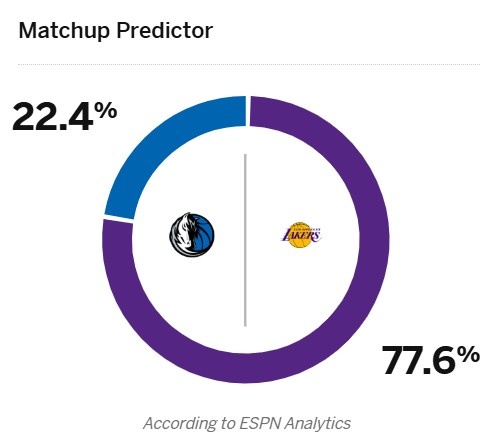ESPN預(yù)測了本場比賽勝率,其中主場作戰(zhàn)的湖人勝率高達(dá)77.6%,獨(dú)行俠為22.4%。