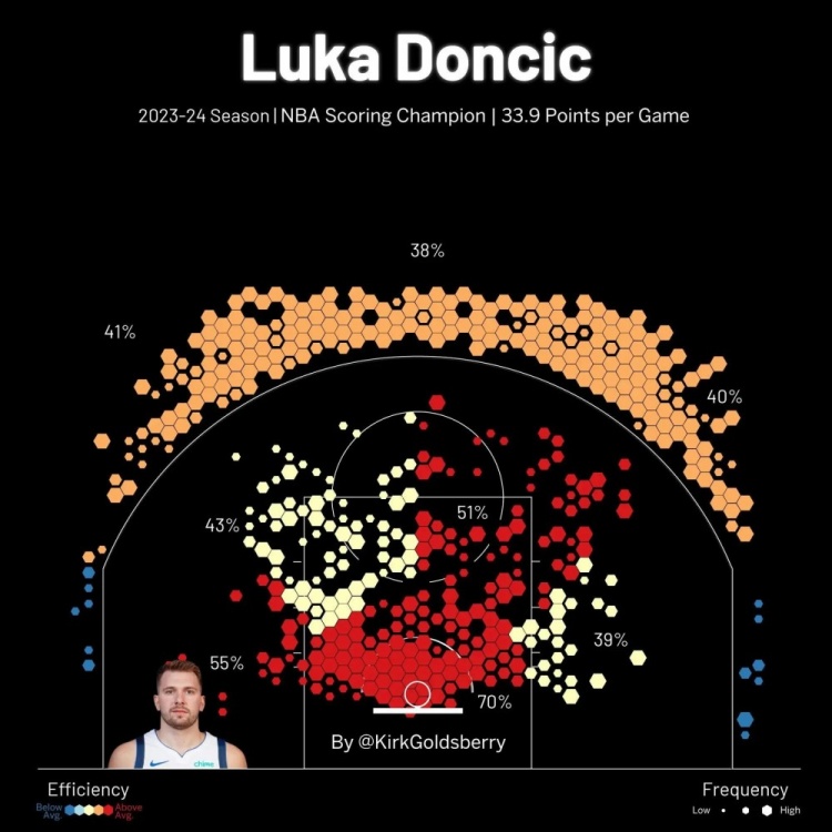 有了東契奇,湖人隊就擁有了籃球界最好的年輕得分手,同時也是本世紀(jì)20年代得分能力的典范。在此前7個賽季中,這位25歲的斯洛文尼亞人場均得分(28.6分)在NBA歷史上排名第三,僅次于邁克爾-喬丹和威爾特-張伯倫。憑借已經(jīng)獲得的5次NBA最佳陣容一陣的榮譽,東契奇是有史以來成就最高的年輕球員之一。上賽季,東契奇以場均33.9分的表現(xiàn)贏得了得分王的頭銜,當(dāng)時他年僅24歲。東契奇的投籃分布圖證明他完全是一位現(xiàn)代籃球的球員,他在三分線外和禁區(qū)內(nèi)都表現(xiàn)出色。