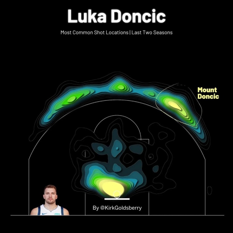 當(dāng)你繪制出東契奇最常見的投籃位置時,有兩個熱點:一個在籃筐附近,另一個是在三分線外左側(cè)45度處。這個外線熱點正是東契奇在周日的比賽中讓布勞恩上當(dāng)?shù)牡胤健@也是東契奇最喜歡的起舞的位置。