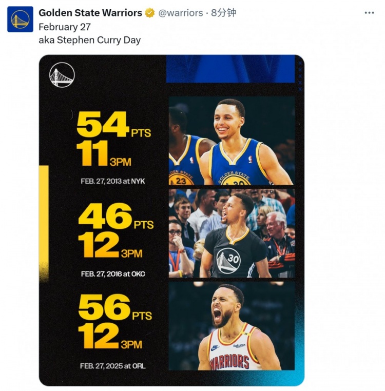 13年&16年的今天也有神級表現(xiàn)!勇士官推:2月28日亦稱“庫里日”
