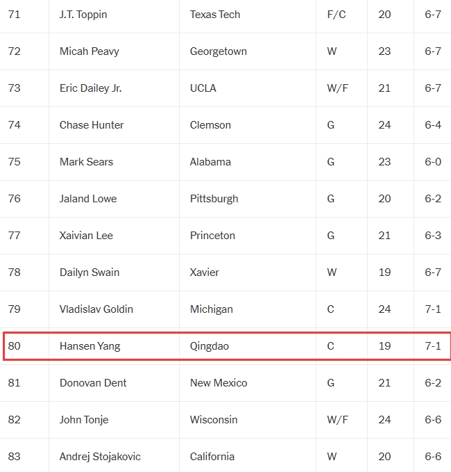 03月01日訊 美媒TA更新了最新一期的2025年選秀大板。中國球員楊瀚森排在第80位。