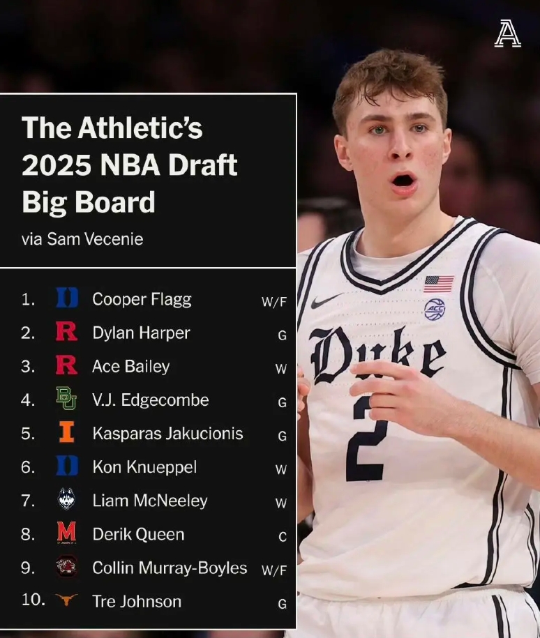 根據(jù)最新的榜單,杜克新星庫珀-弗拉格依舊占據(jù)榜首,來自羅格斯大學(xué)的雙子星迪倫-哈珀和埃斯-貝利分列二三。