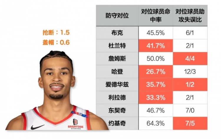 數(shù)據(jù)顯示,卡馬拉賽季至今,有59.5%的時間防后衛(wèi),30.5%的時間防前鋒,防中鋒的時間則是達到了10%。