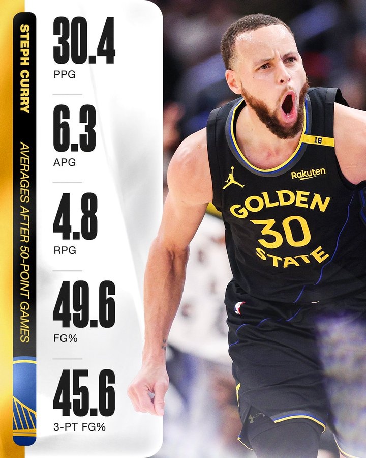 美媒SportsCenter曬出數(shù)據(jù),在庫里砍下50分之后的接下來一場比賽中(生涯共13場),他場均可以拿到30.4分6.3助攻4.8籃板,投籃命中率49.6%,三分命中率45.6%。