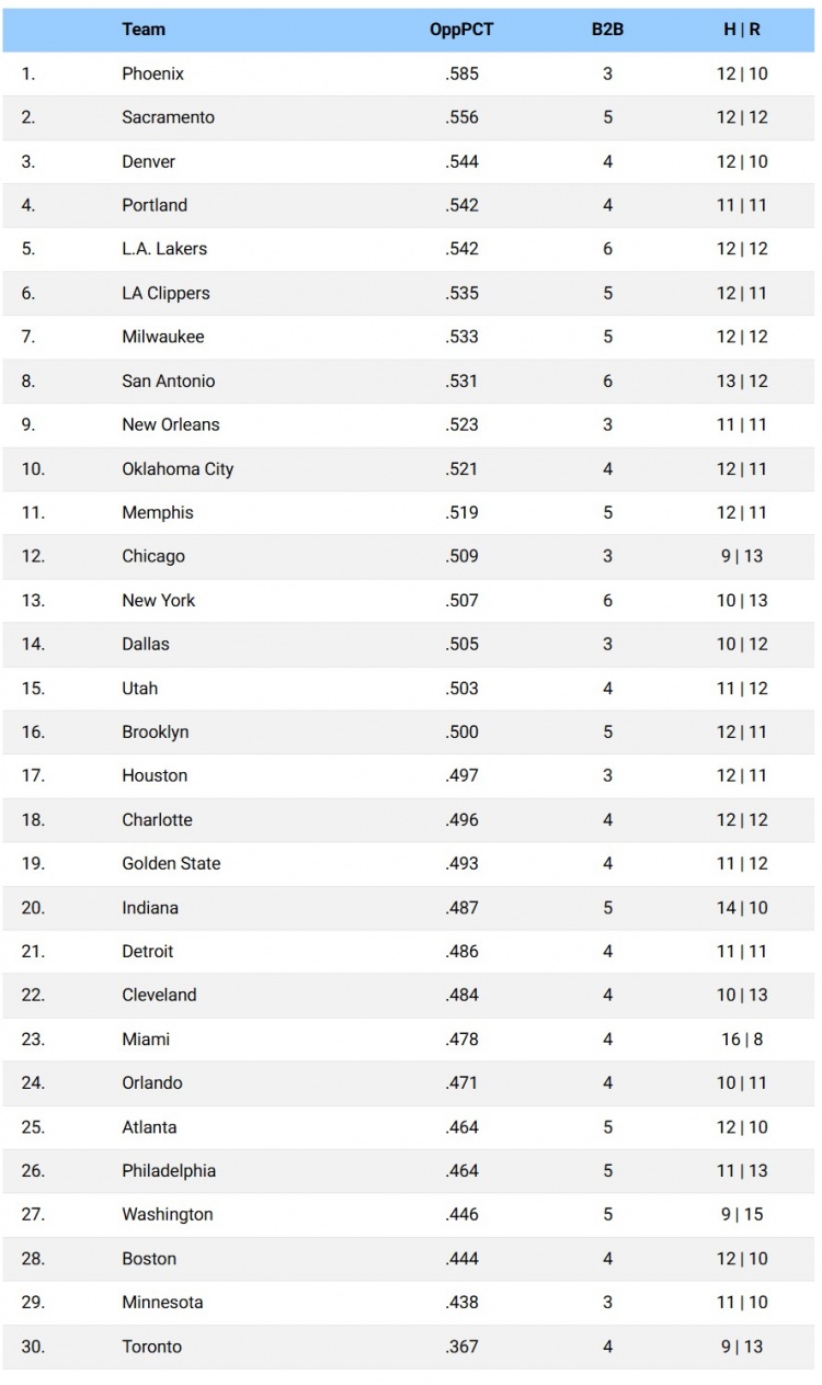 以下是各隊(duì)剩余賽程的強(qiáng)度排名,按對(duì)手累計(jì)勝率從高到低排序: