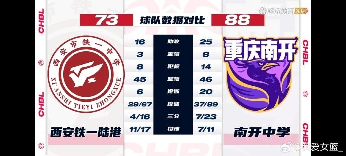 數(shù)據(jù)方面:南開(kāi)中學(xué)胡馨月15分,汪子涵13分8助攻,王思琪12分12籃板6搶斷,谷滿杰11分9助攻7搶斷。西安鐵一陸港中學(xué)張賀玥19分5籃板,張桐菲18分6籃板,孫子喻11分5籃板。