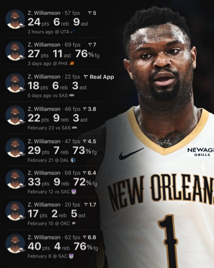 能上就很強(qiáng)!錫安近10場(chǎng)場(chǎng)均攬26.3分6.6板5.6助 命中率高達(dá)65.2%