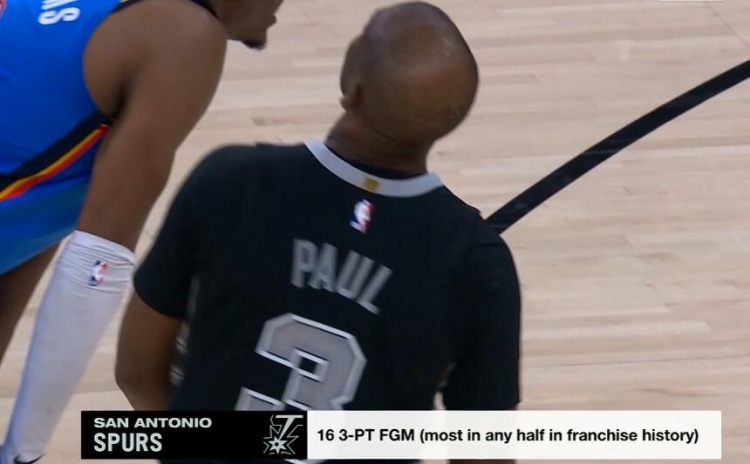上半場比賽,馬刺全隊三分26中16,16記三分創(chuàng)造了馬刺隊史任意半場三分命中數(shù)紀錄。
