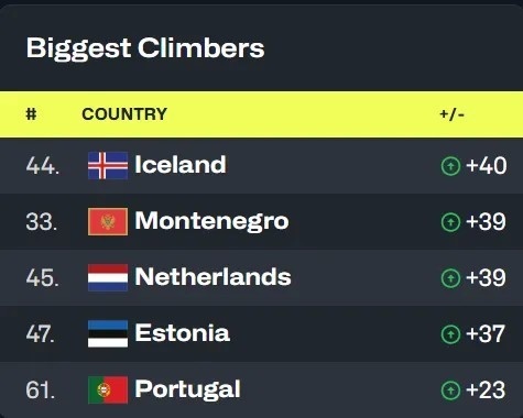 2023年9月,克羅地亞再掉五個(gè)名次,排名正式落到中國(guó)身后,他們?cè)谀莻€(gè)被新納入統(tǒng)計(jì)的窗口期合計(jì)輸給瑞典荷蘭烏克蘭55分,令人無語。