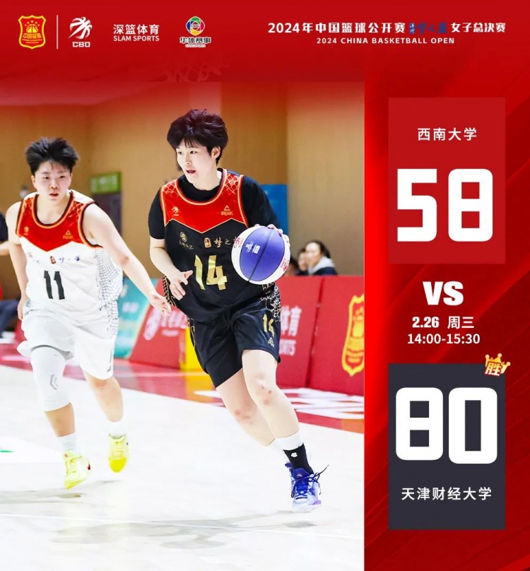 上半場(chǎng)首節(jié),兩隊(duì)打得相對(duì)膠著,比分緊咬。第二節(jié),西南大學(xué)手感欠佳,單節(jié)只得到9分。天津財(cái)經(jīng)大學(xué)則保持著不錯(cuò)的進(jìn)攻勢(shì)頭,單節(jié)拿到25分。半場(chǎng)結(jié)束,天津財(cái)經(jīng)大學(xué)37-24領(lǐng)先西南大學(xué)。下半場(chǎng),西南大學(xué)7號(hào)應(yīng)茵、12號(hào)莫琇雅前后場(chǎng)籃板拼搶積極,但無奈前期存在一定差距,最終西南大學(xué)58-80不敵天津財(cái)經(jīng)大學(xué)。