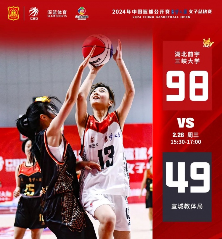 上半場(chǎng),湖北前宇三峽大學(xué)11號(hào)劉欣怡、2號(hào)張歡分別命中兩分,幫助球隊(duì)取得領(lǐng)先。宣城教體局6號(hào)張紫涵扳回兩分后,湖北前宇三峽大學(xué)在技術(shù)和經(jīng)驗(yàn)上的優(yōu)勢(shì)逐漸顯露,打出一波8-0的得分潮。半場(chǎng)結(jié)束,湖北前宇三峽大學(xué)53-21領(lǐng)先宣城教體局。易邊再戰(zhàn),宣城教體局雖然頑強(qiáng)拼搏,但年輕小將在實(shí)力上和對(duì)手還是存在著差距,將分差越拉越大。最終,湖北前宇三峽大學(xué)98-49戰(zhàn)勝宣城教體局。