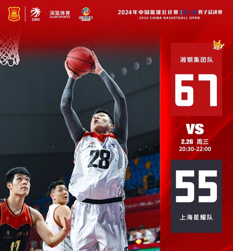 上半場(chǎng)開始,湘鋼集團(tuán)進(jìn)攻十分強(qiáng)勢(shì),取得9-4領(lǐng)先。26號(hào)陳雙、28號(hào)蔡士港相繼投籃命中,上海星耀出現(xiàn)失誤,首節(jié)湘鋼集團(tuán)24-11領(lǐng)先上海星耀。次節(jié),上海星耀加強(qiáng)防守并在籃板的拼搶中更積極主動(dòng)。但湘鋼集團(tuán)沒有給其太多機(jī)會(huì),半場(chǎng)結(jié)束,湘鋼集團(tuán)領(lǐng)先上海星耀16分。下半場(chǎng),兩隊(duì)沒有拉開太大分差,依靠上半場(chǎng)的領(lǐng)先優(yōu)勢(shì),湘鋼集團(tuán)以67-55戰(zhàn)勝上海星耀。
