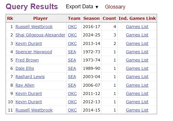 根據(jù)數(shù)據(jù)統(tǒng)計(jì),這是亞歷山大本賽季第4次砍下50+,他追平威少,并列雷霆隊(duì)史單賽季50+場(chǎng)次榜榜首。