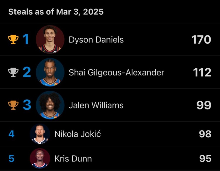 本賽季總搶斷數(shù)前5:丹尼爾斯170次遙遙領(lǐng)先 SGA第2 約基奇第4